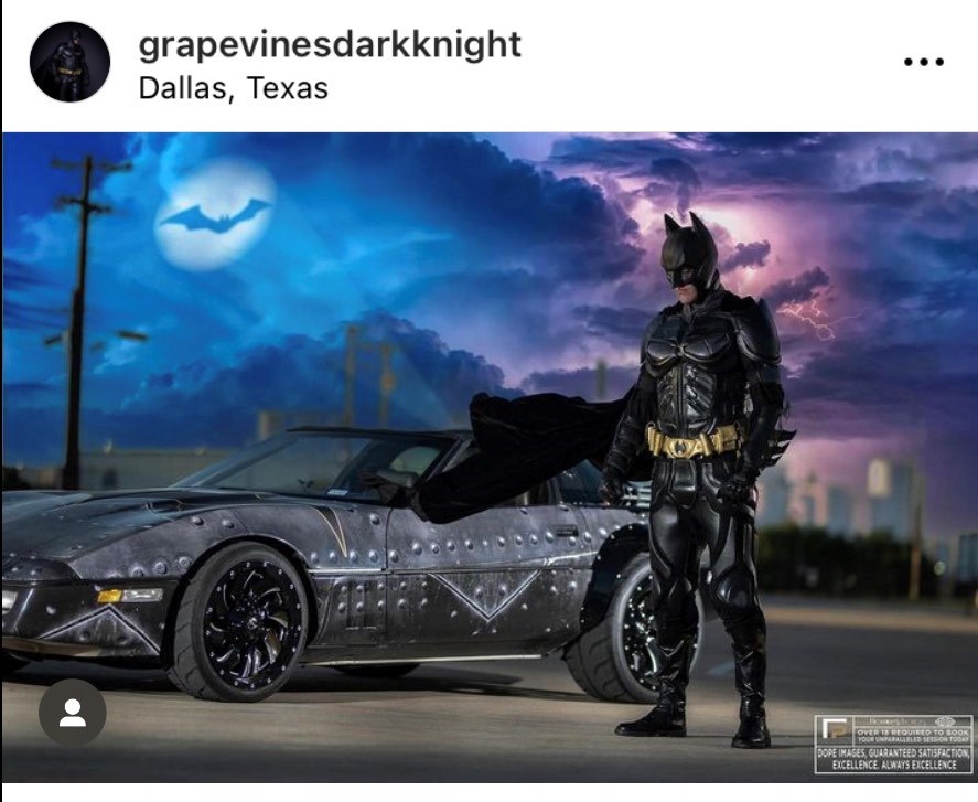 Enjoy an appearance by Grapevine's Dark Knight. Grapevine's Dark Knight is making a positive impact on all who come into contact with BATMAN... even the jokers. Enjoy 30-60 minutes with Batman and check out the Batvette.