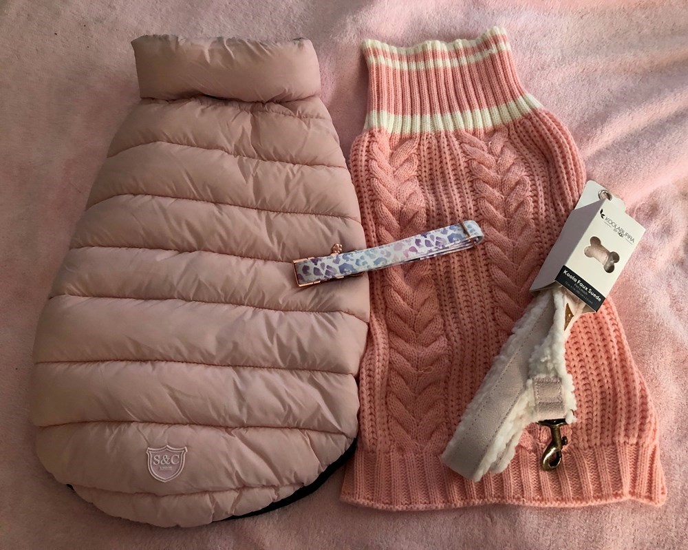All New! Puffy Jacket, Cable Knit Sweater, Pastel Animal Print Collar, White Fur Leash with Suede Back (all medium)
