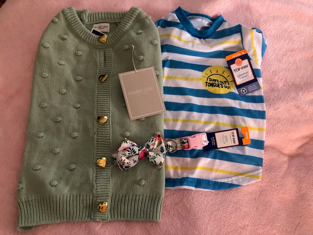 New! Beautiful green sweater with gold heart buttons, Summer Shirt “Suns Out, Tongues Out”, Floral Collar with Bow (all medium)