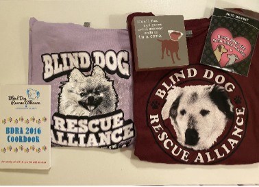 Your choice of two t-shirt cover dogs and in many colors, from lavender (shown with Iggy), pink, maroon (shown with Teddy), navy, black, gray. BDRA cookbook. Blind Dogs see with their hearts car magnet. It’s all fun and games until someone ends up in a cone, primitive hollow wooden box to sit or hang.