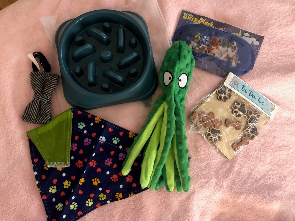 Slow Feeder Bowl - Medium Crinkle Octopus Toy Paw Print Bandana (green felt on back) Bow Tie “Dog Tired” Sleep Mask Tic-Tac-Toe Game with Paws & Bones